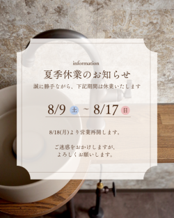 2025/07/18 夏季休業について ◆夏季休業のお知らせ◆ 平素より奈良屋建設をご愛顧いただき、誠にありがとうございます。 誠に勝手ながら、下記の期間を夏季休業とさせていただきます。 ■休業期間:2025年8月9日(土)~8月17日(日) 休業中のお問合せ、ご連絡はお問合せフォームよりお願いいたします。 期間中にいただいたお問い合わせにつきましては、8月18日(月)より順次対応させていただきます。 皆様にはご不便をおかけいたしますが、何卒ご理解のほどよろしくお願い申し上げます。