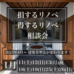 2024/12/19 1月相談会 【損するリノベ 得するリノベ】 【損するリノベ 得するリノベ相談会】 2025年4月から建築基準法が変わります。 リノベーションをお考えの方 工事するタイミングで“得する”or“損する”かも ◆建築基準法が変わる事でどんなメリットとデメリットがあるの? ◆いつ工事するのがいい? 色々な疑問にお答えします。 ●日程 1月11(土)12(日)13(月祝)18(土)19(日)25(土)26(日) ※別日をご希望の方はご相談ください。 ●開催時間 10:00~/ 13:00~/ 15...