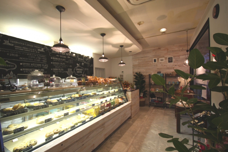 ショーケースには種類豊富なベーグルが並び、