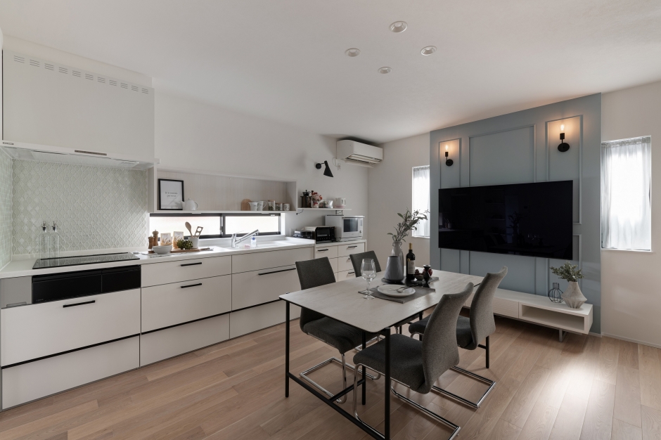 ホワイトオークの挽板フローリングで柔らかさを出しつつネイビーやターコイズなどアクセントカラーで大人女子を演出。