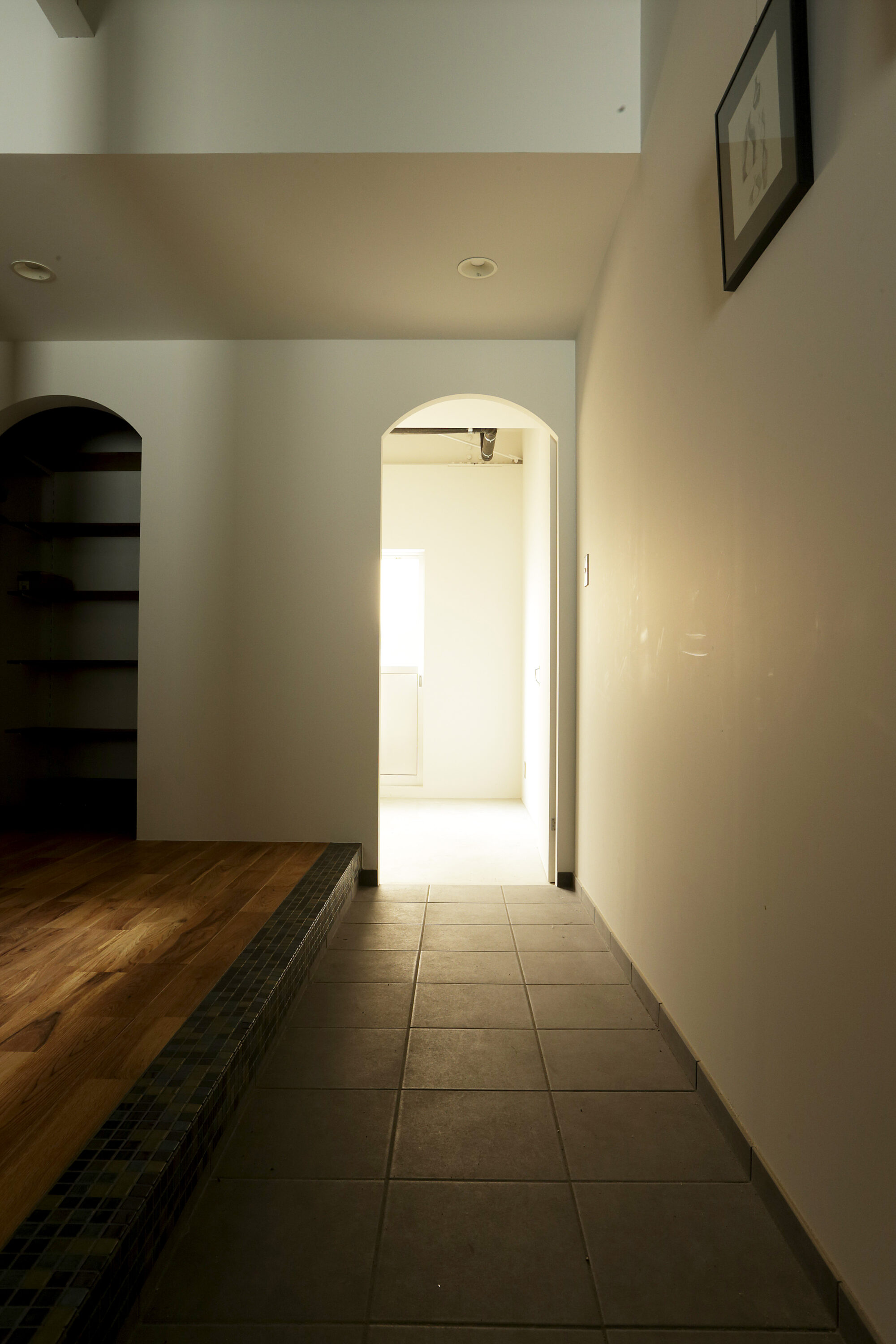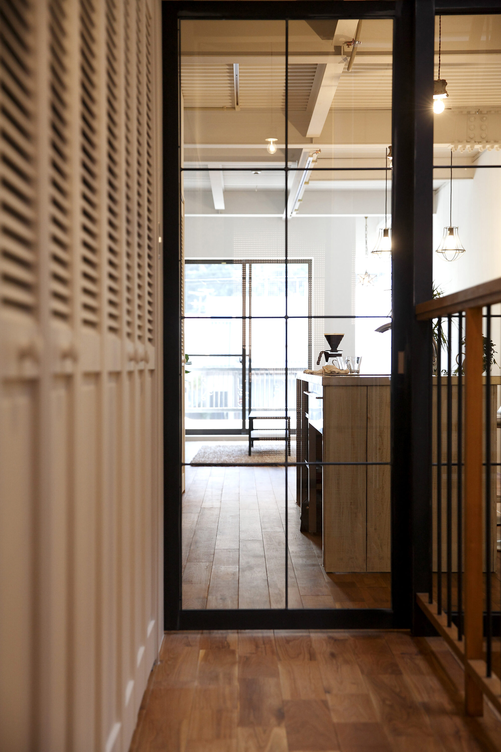 リビングの光が廊下にも届くようにガラスの間仕切り壁を採用。