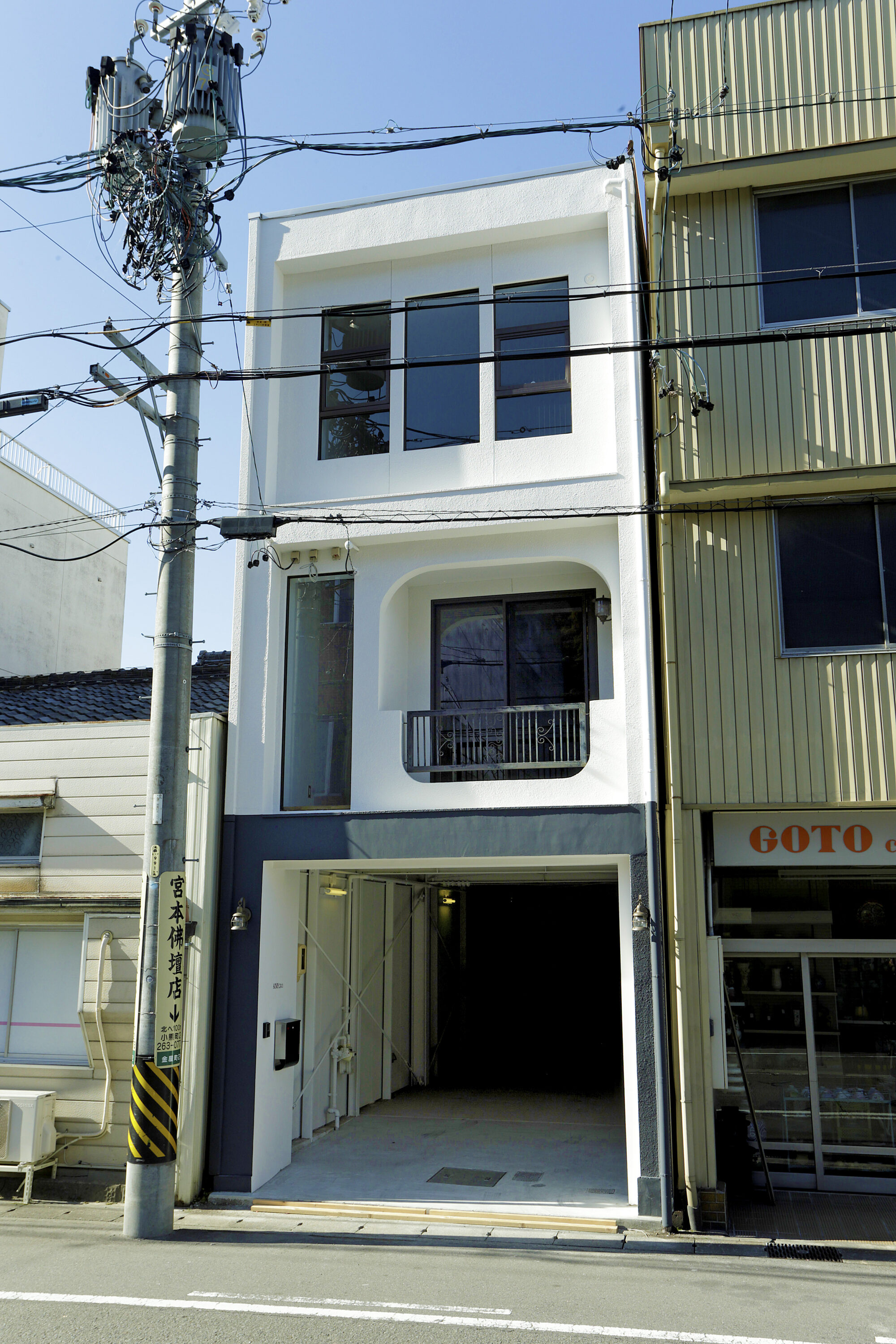 岐阜市内にある鉄骨造3階建て、間口3.8m、奥行17.4mの細長い建物。