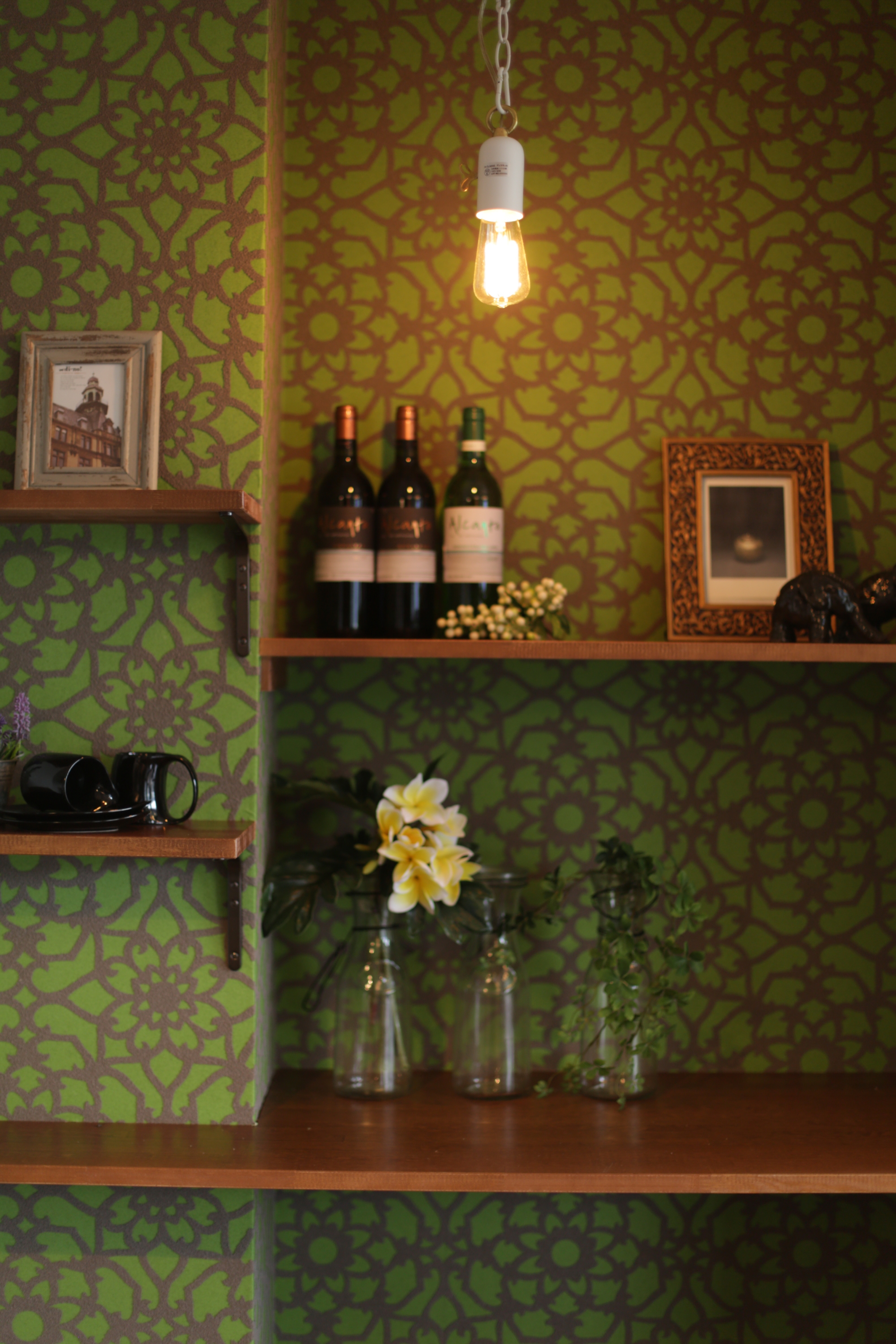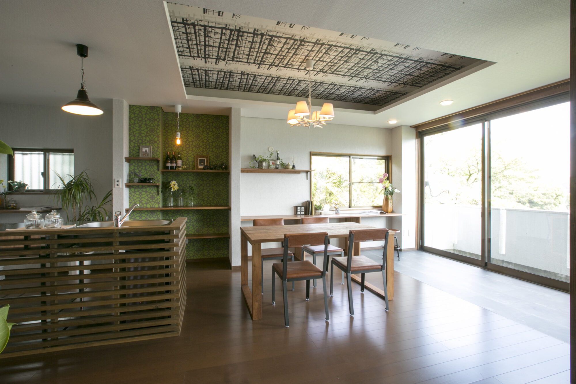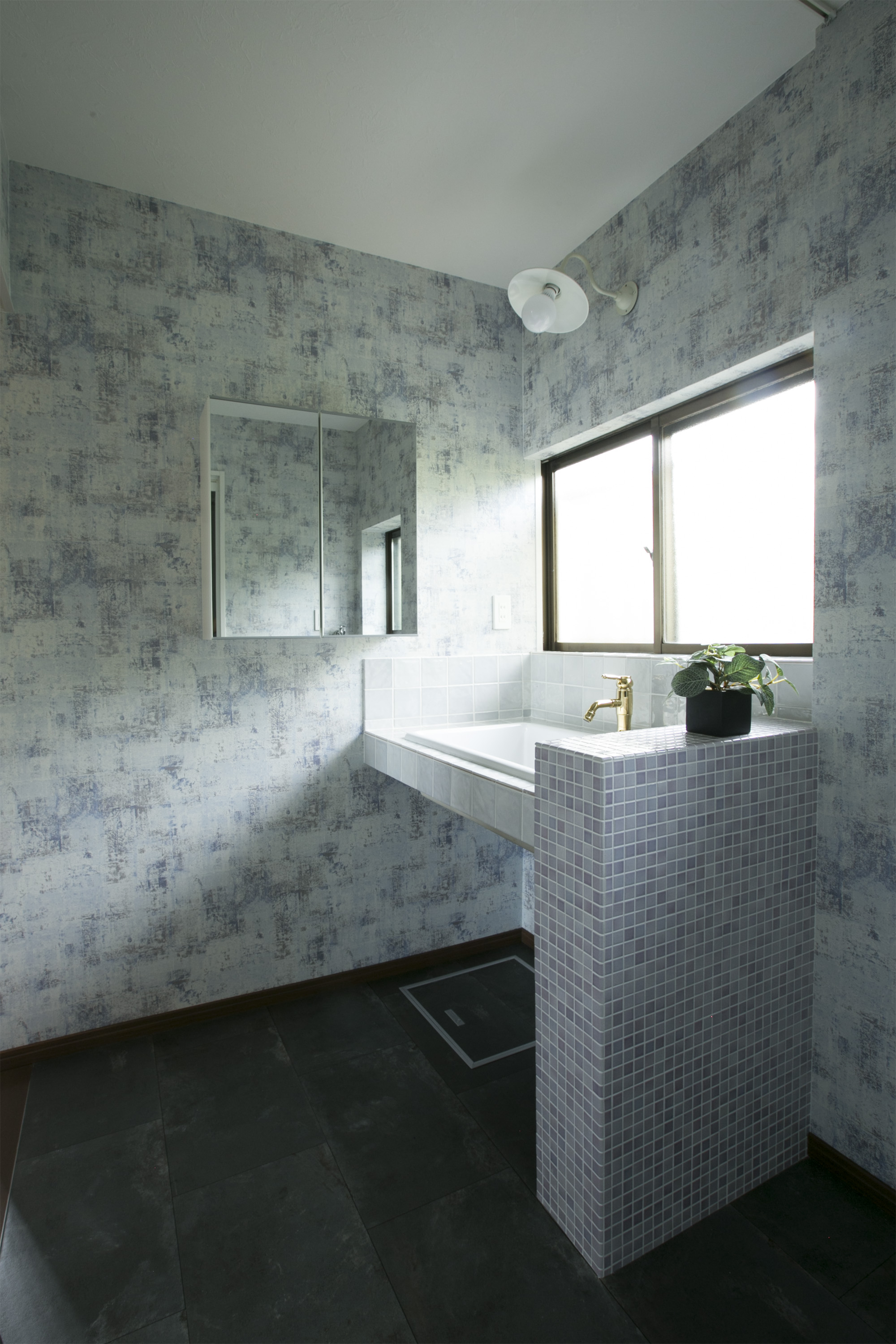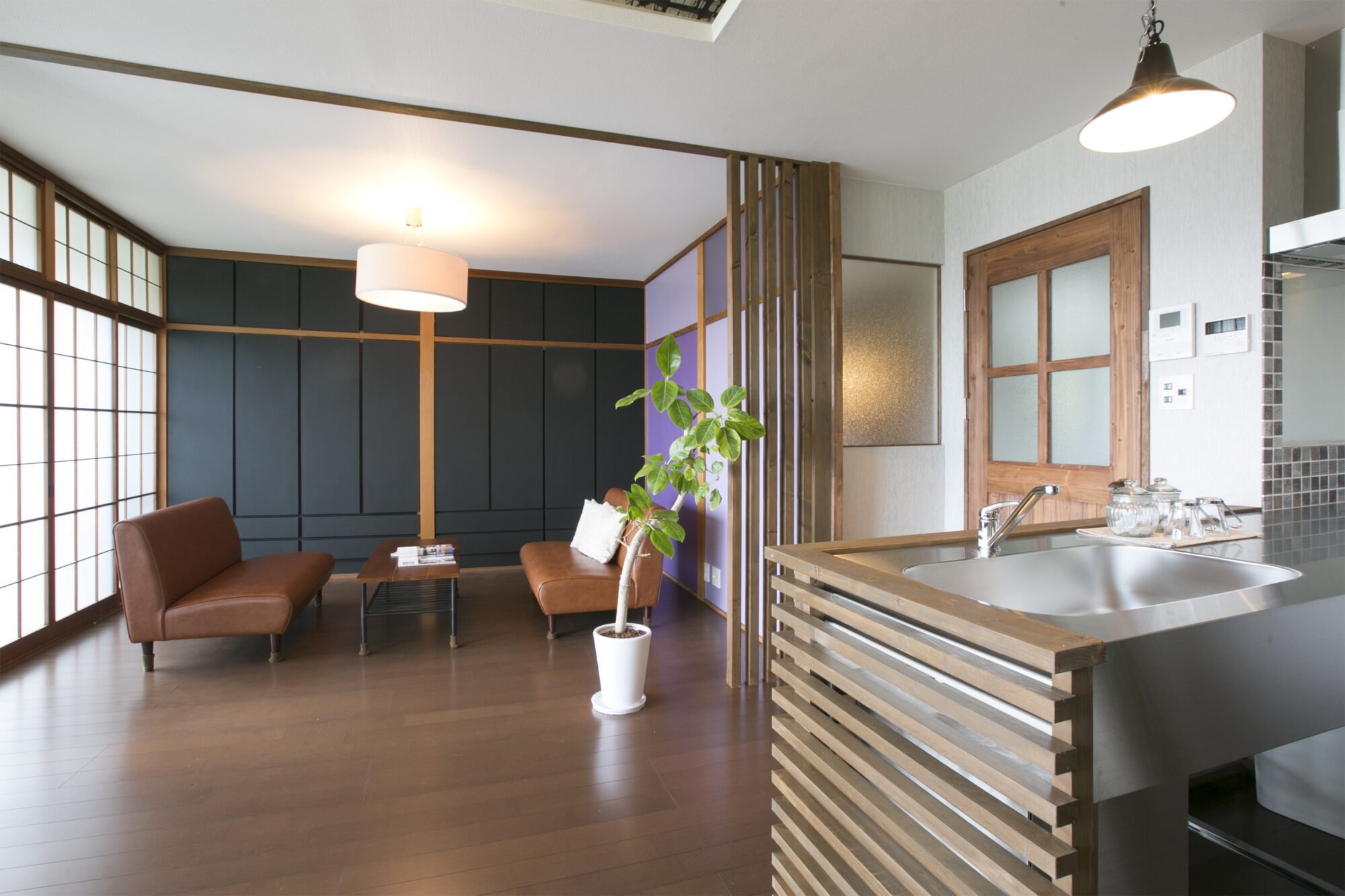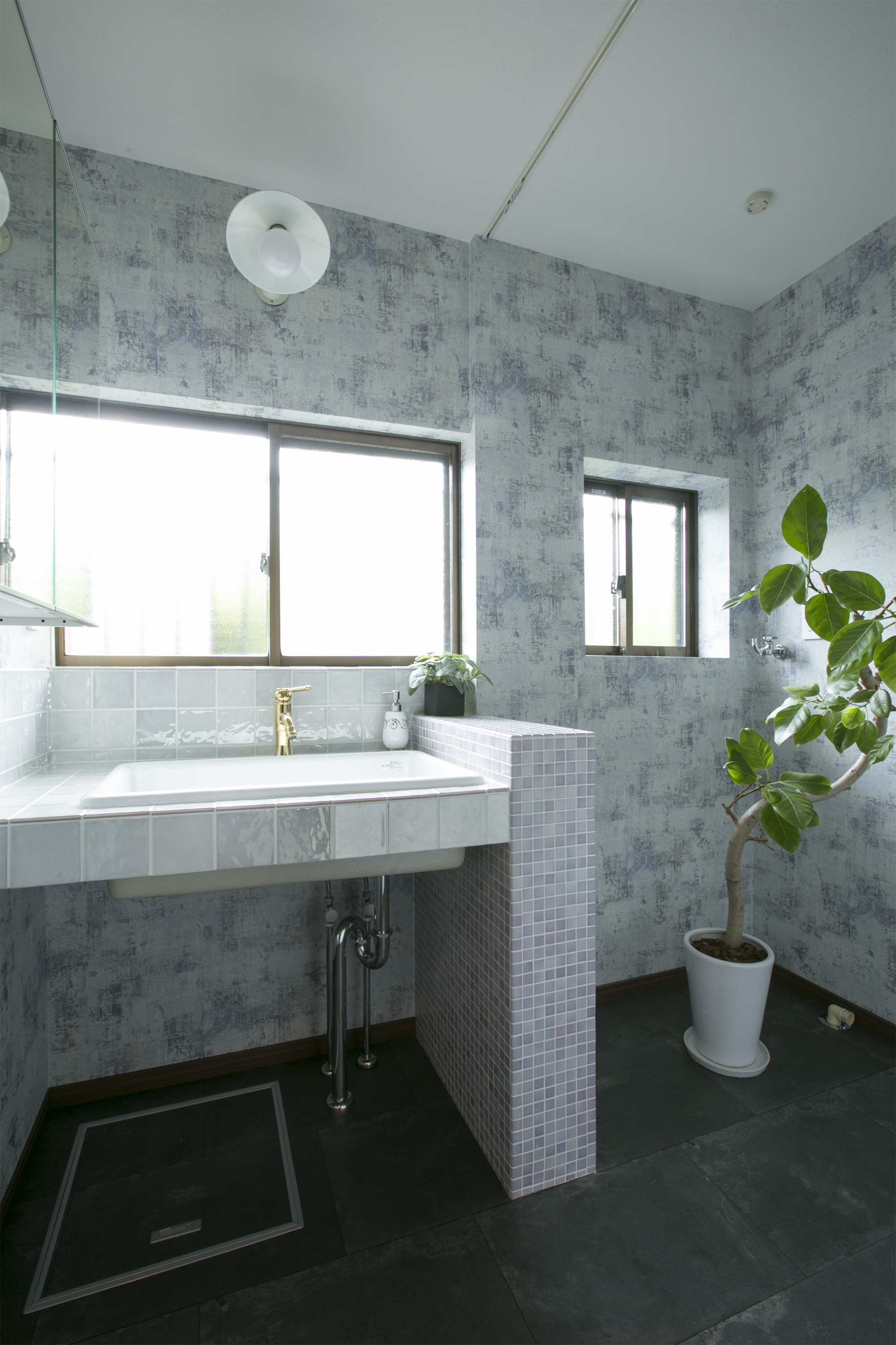 洗面にはブルー、リビングにはパープル、キッチンにはグリーンを挿し色に、各部屋に個性を出したミックステイストな内装は奥様のこだわり。