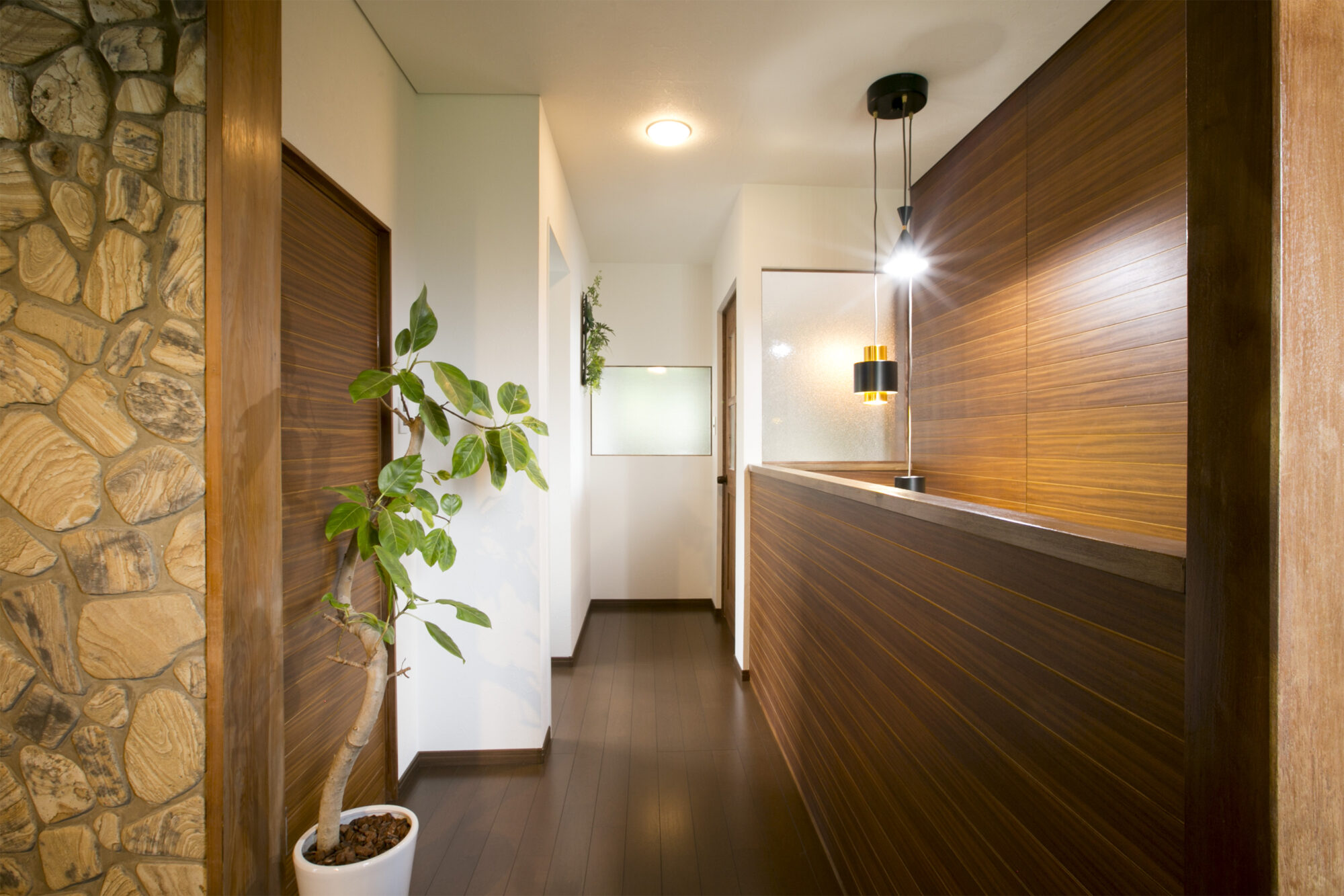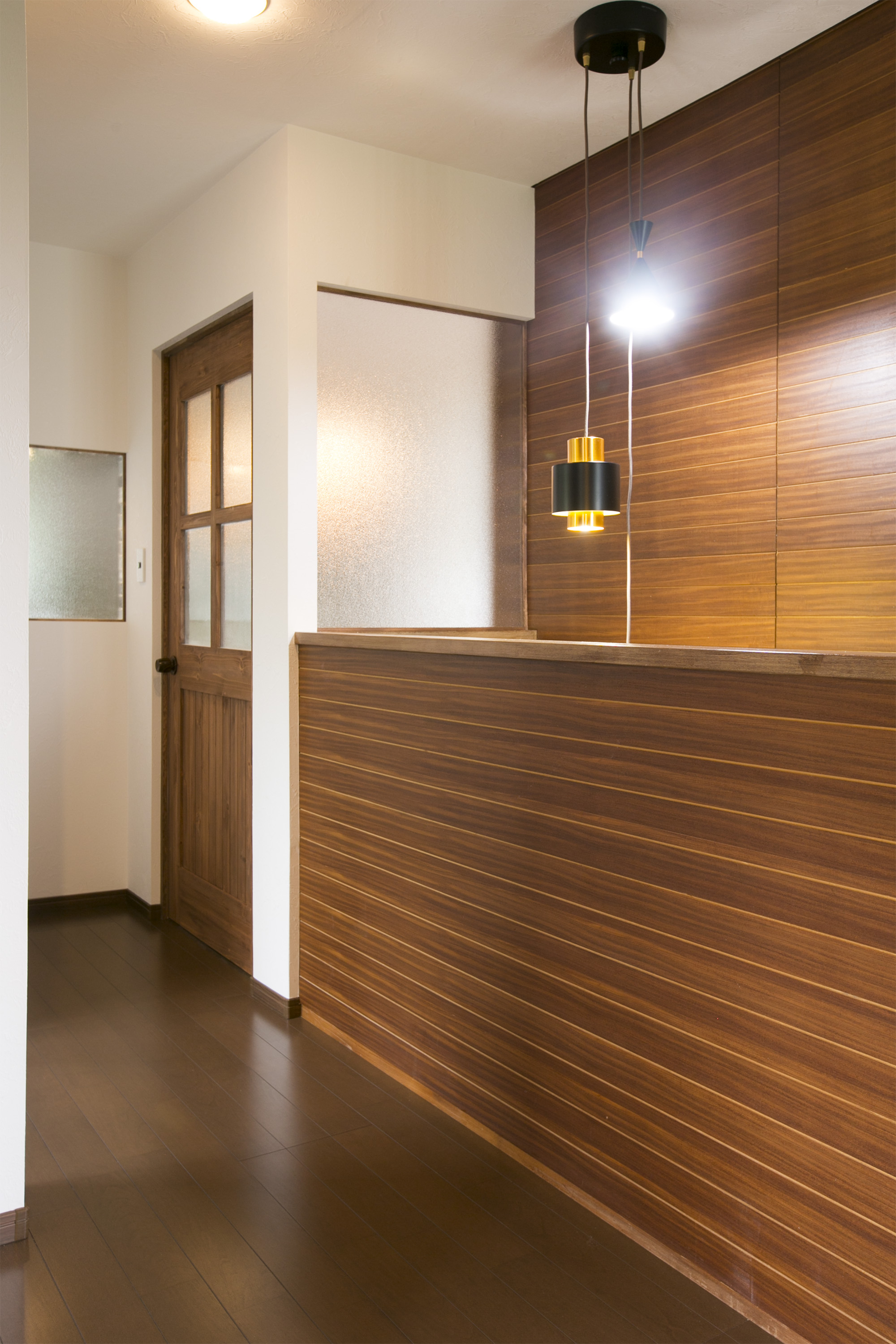 玄関や廊下は、別荘時代にこだわって作られた木板貼りの壁を残しつつ新しく設けた白い間仕切り壁に光が反射してより明るい空間に。