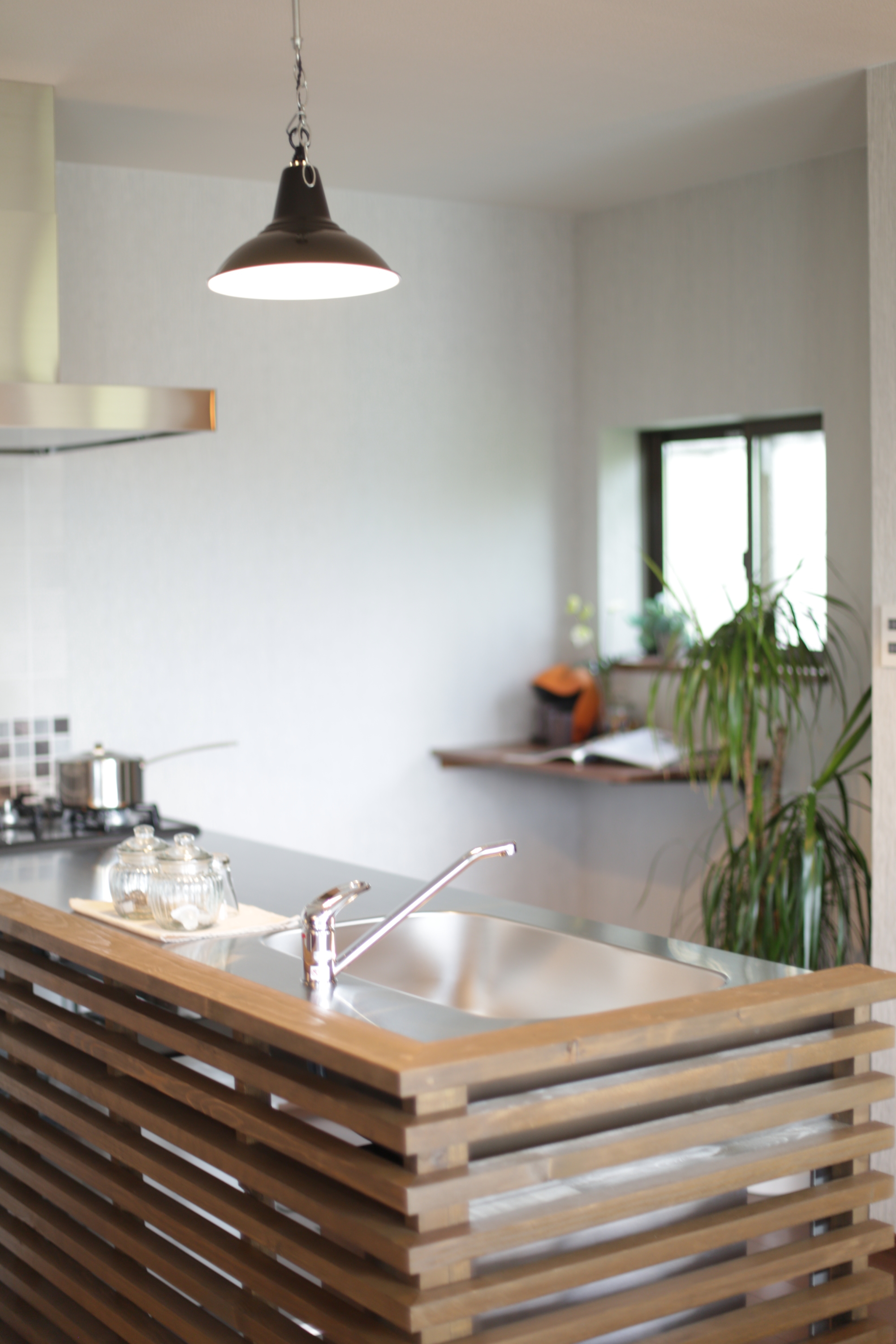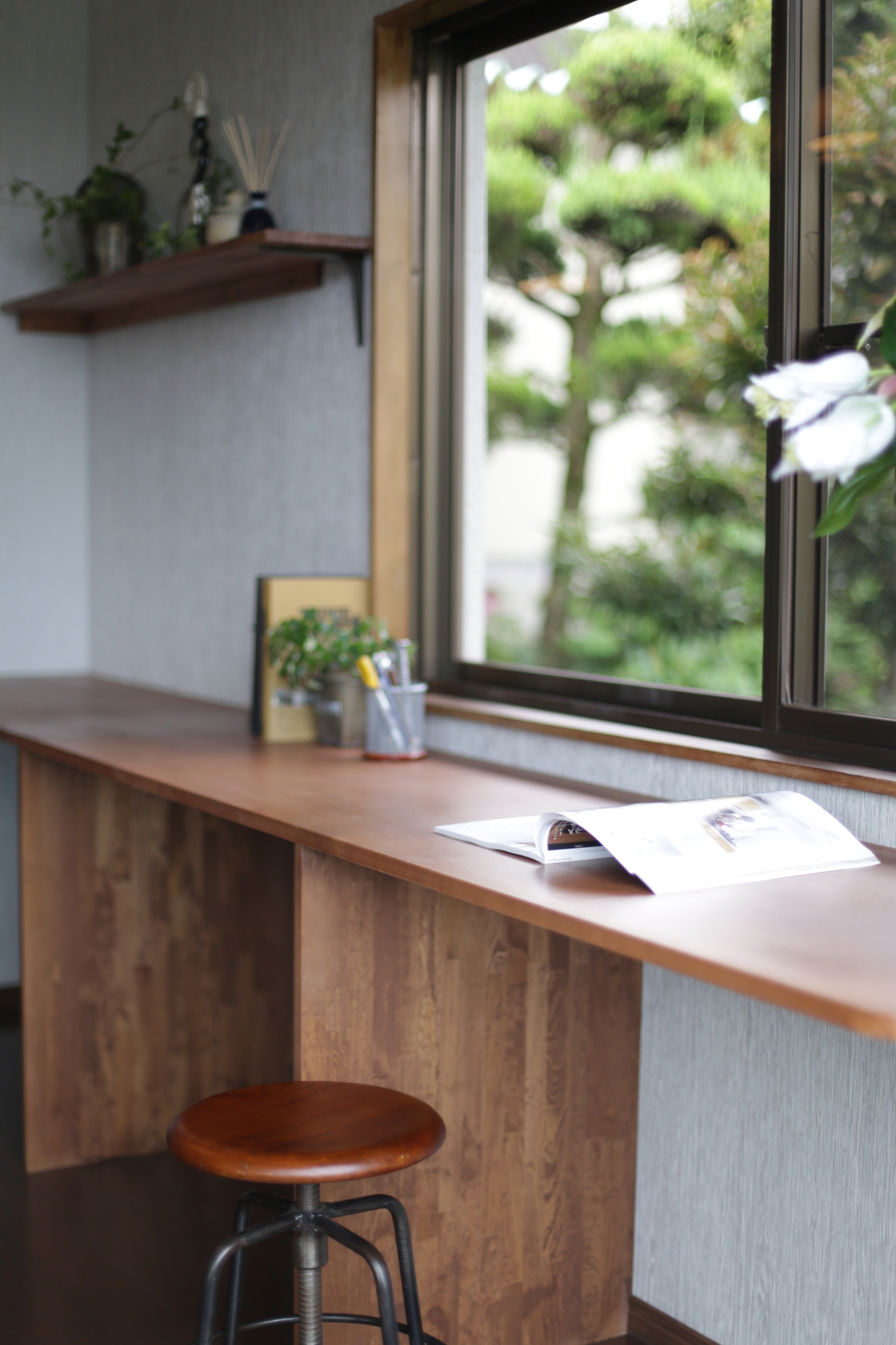 大工さんに格子型の腰壁カウンターを造作してもらいました。