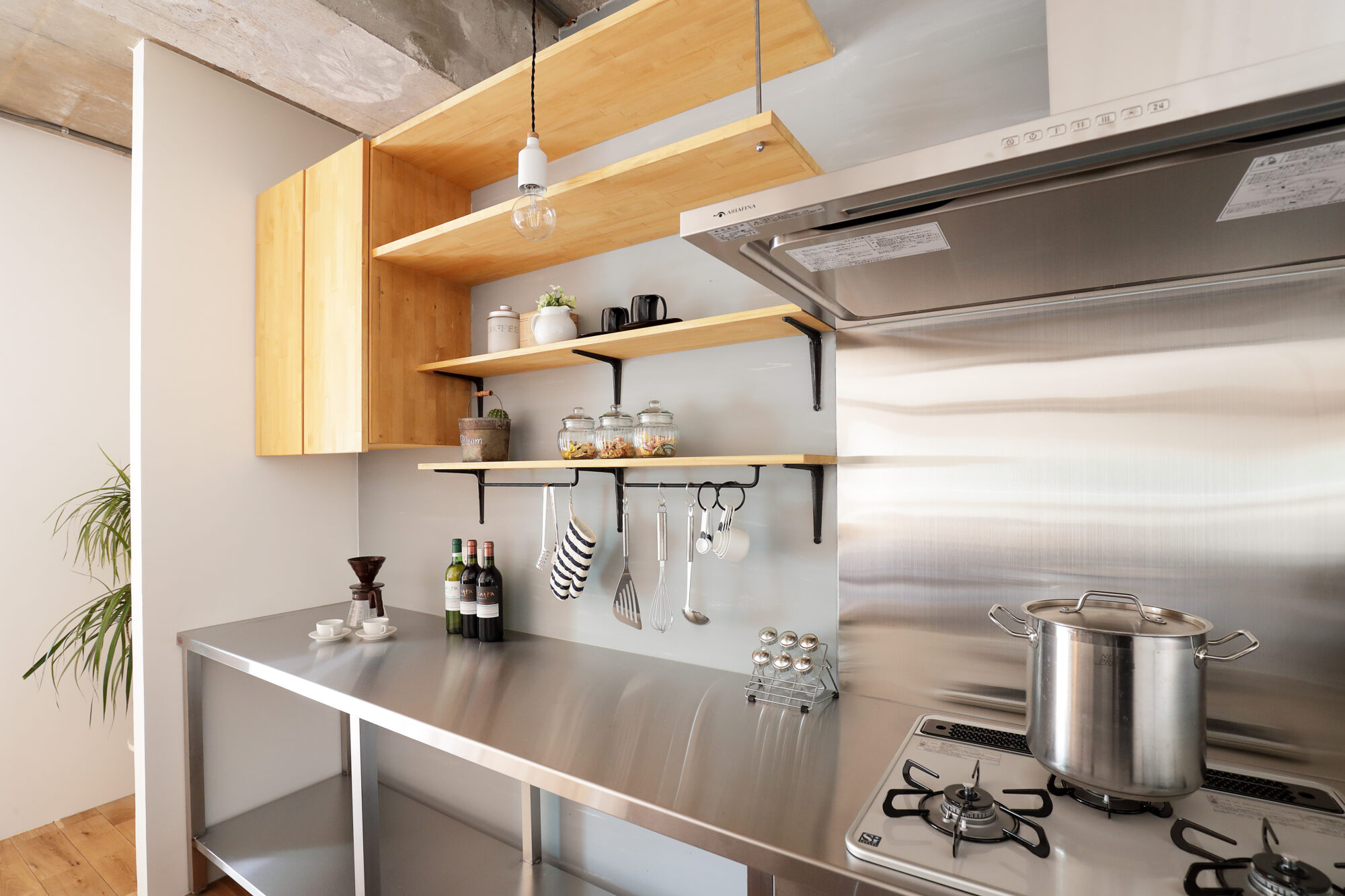 ステンレスがヒカリ輝く業務用のキッチンは広い作業スペースをとり、