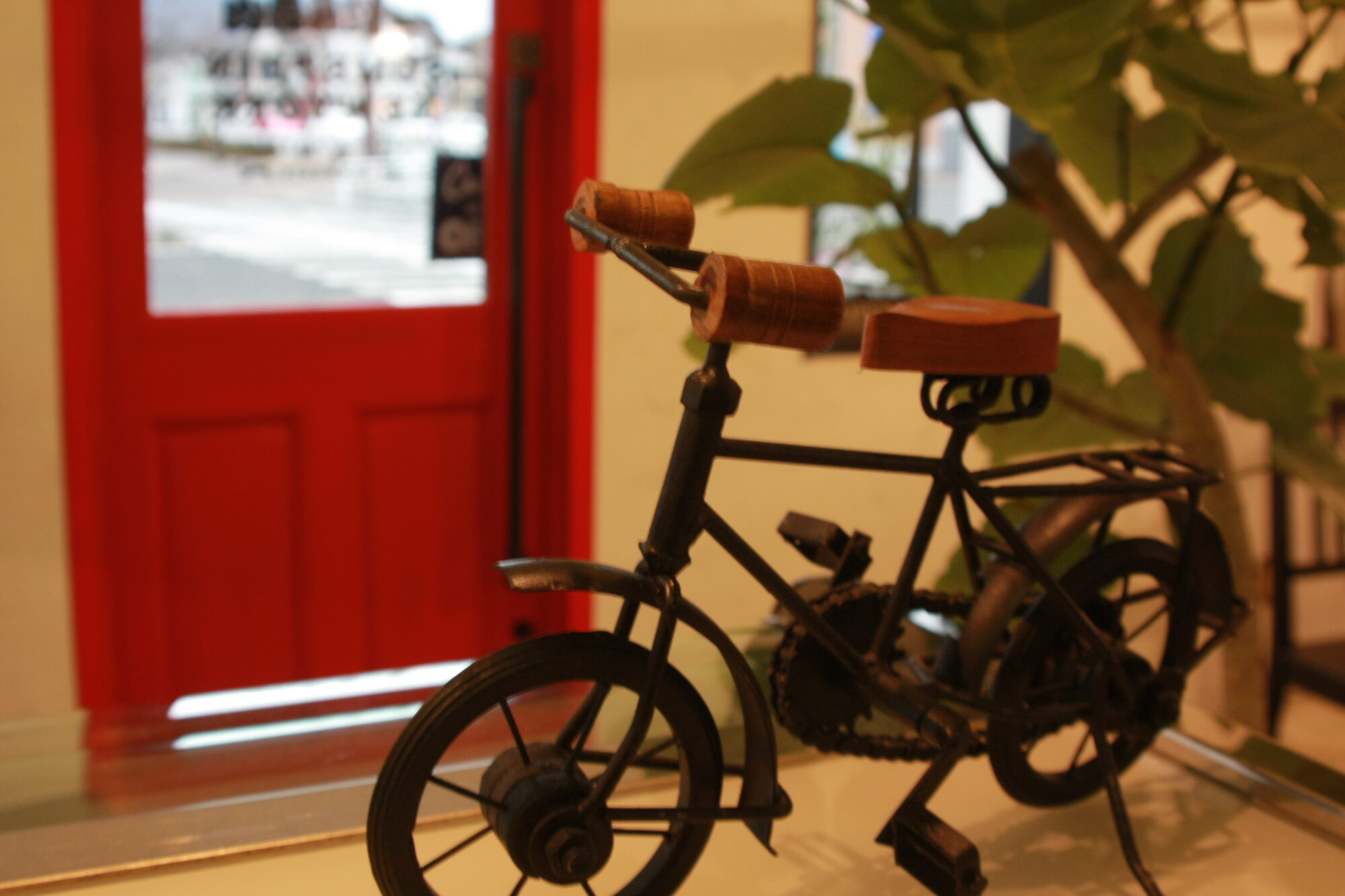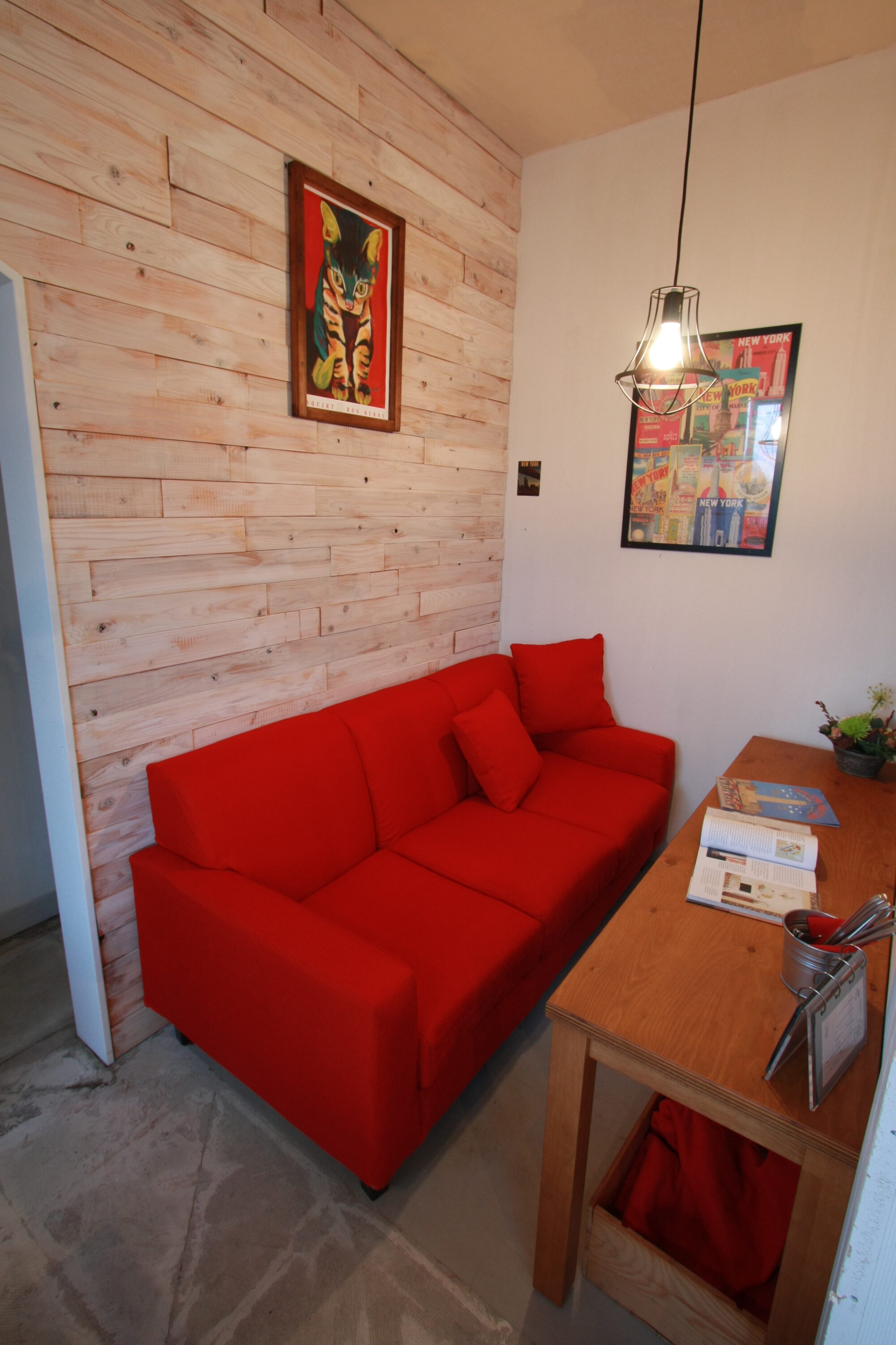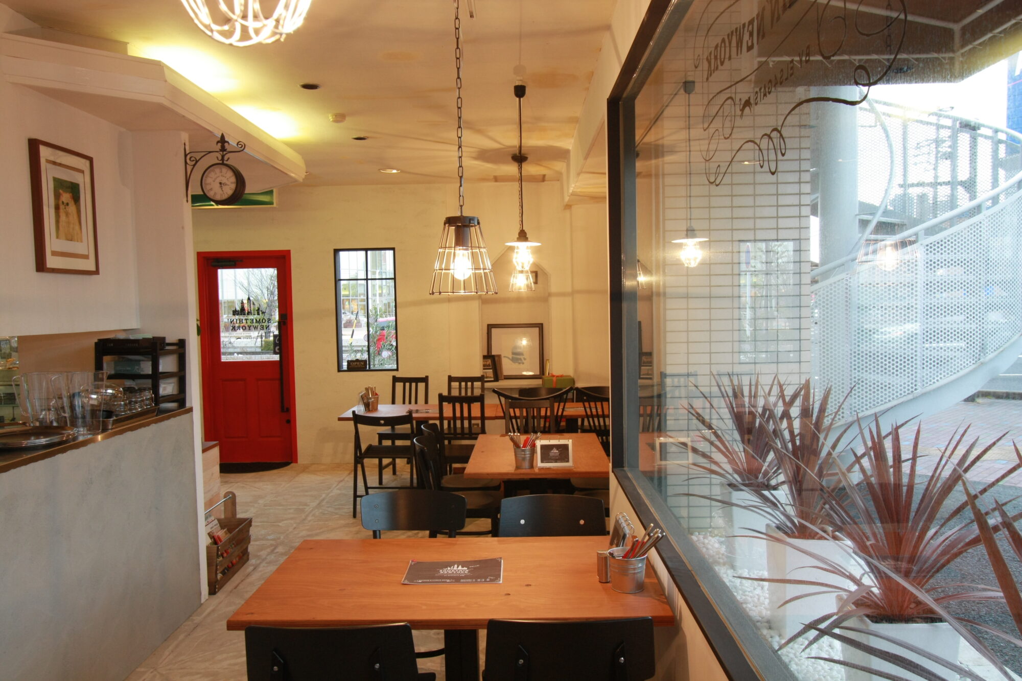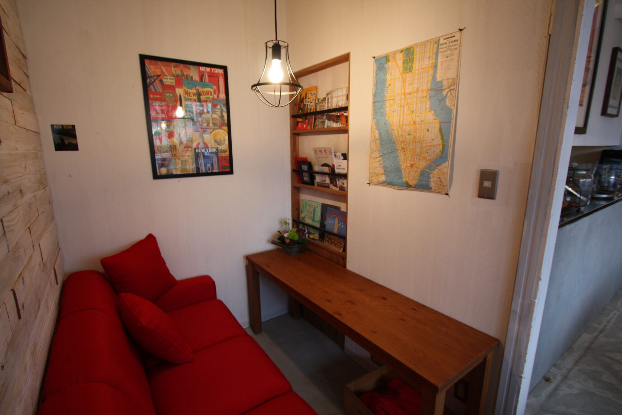 人目を引くビビットな赤い扉を開けるとそこはニューヨークのカフェ。