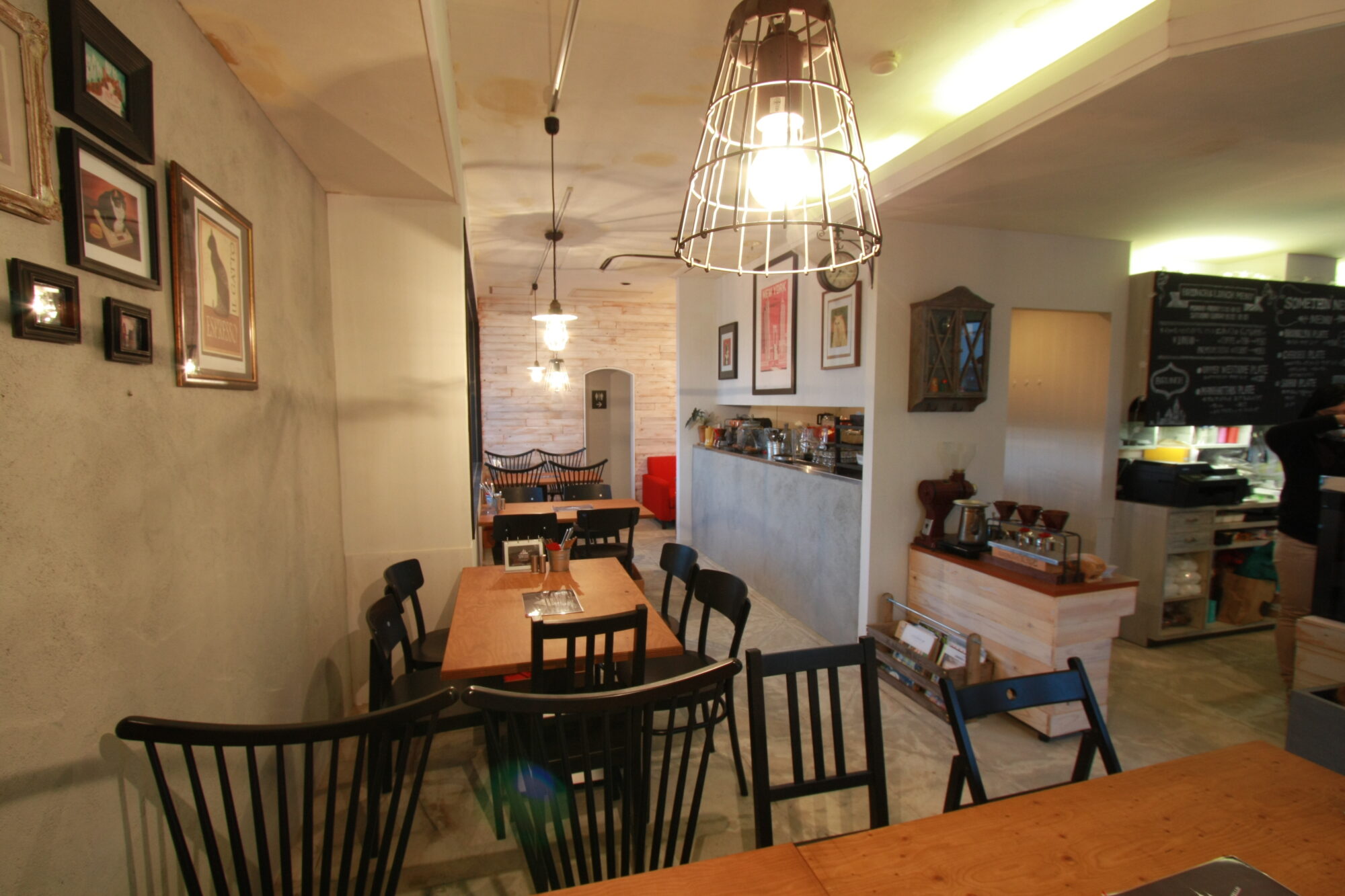 シンプルな内装に黒板やザラ板、赤色、絵画の額縁など装飾品でアクセントを付け、店内の雰囲気を演出。